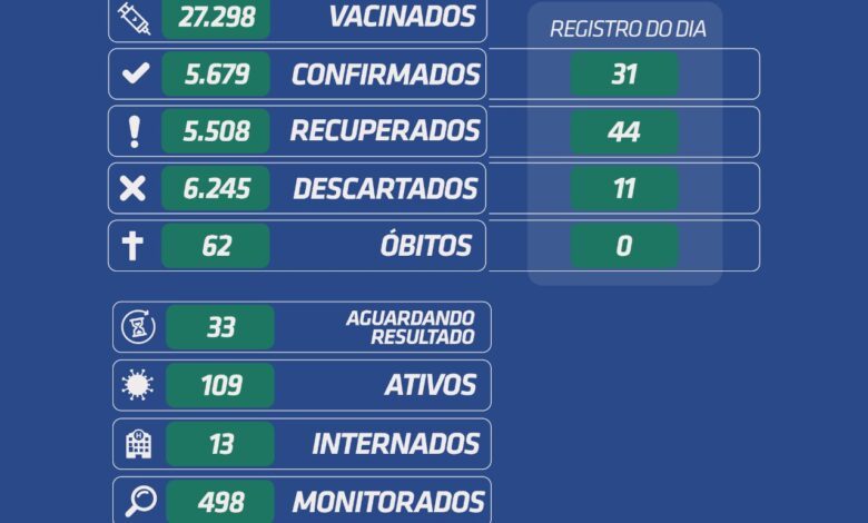 O Município já confirmou 5.679 casos e houve 62 óbitos. No momento, 33 pessoas aguardam resultado dos exames e 5.508 pacientes já estão recuperados.