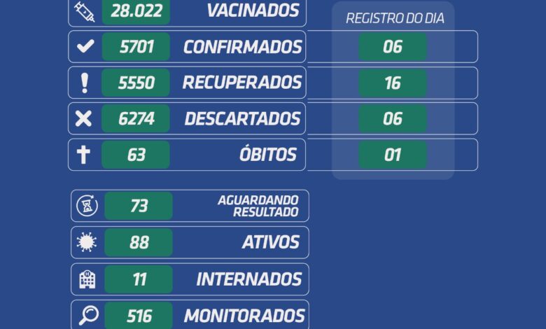 O Município já confirmou 5.701 casos e houve 63 óbitos. No momento, 73 pessoas aguardam resultado dos exames e 5.550 pacientes já estão recuperados.