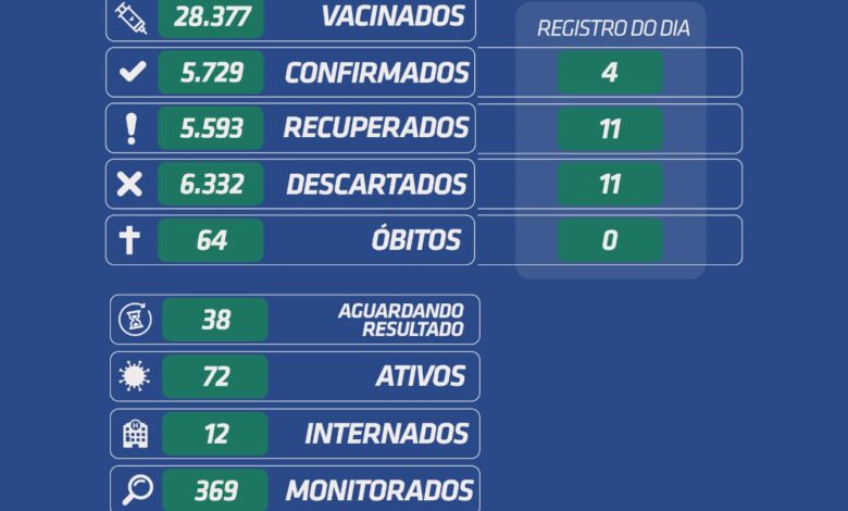 No total, 72 casos estão ativos, sendo que 12 pacientes estão internados em Unidades Hospitalares de referência para Covid-19.