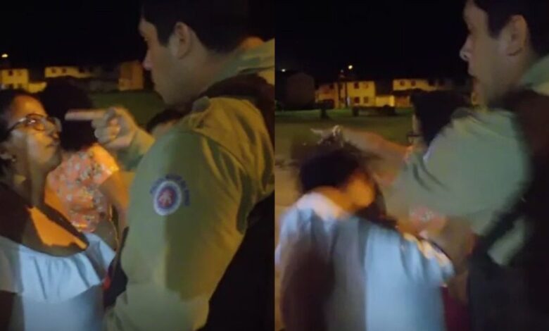 “Agora atira. Manda ver, vai na fé”, diz a mulher, logo antes do policial se direcionar ao local onde ela estava. Furioso, ele aponta o dedo para ela e diz: “eu meto o dedo na sua cara”. A mulher, então, afasta o dedo do agente, que revida a ação com um tapa no seu rosto.