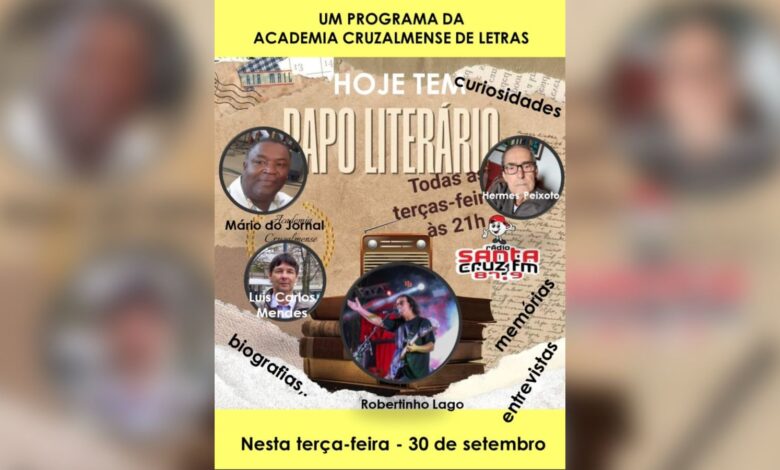 O programa Papo Literário, transmitido pela Rádio Santa Cruz FM 87.9, receberá o músico Robertinho Lago, nesta terça-feira, 30. A atração será transmitida ao vivo às 21h e ocorrerá em formato de bate-papo cultural. Os apresentadores serão Mário Araújo (Mário do Jornal), Dr. Hermes Peixoto e Luís Carlos Mendes, que são membros fundadores da Academia Cruzalmense de Letras (ACL).